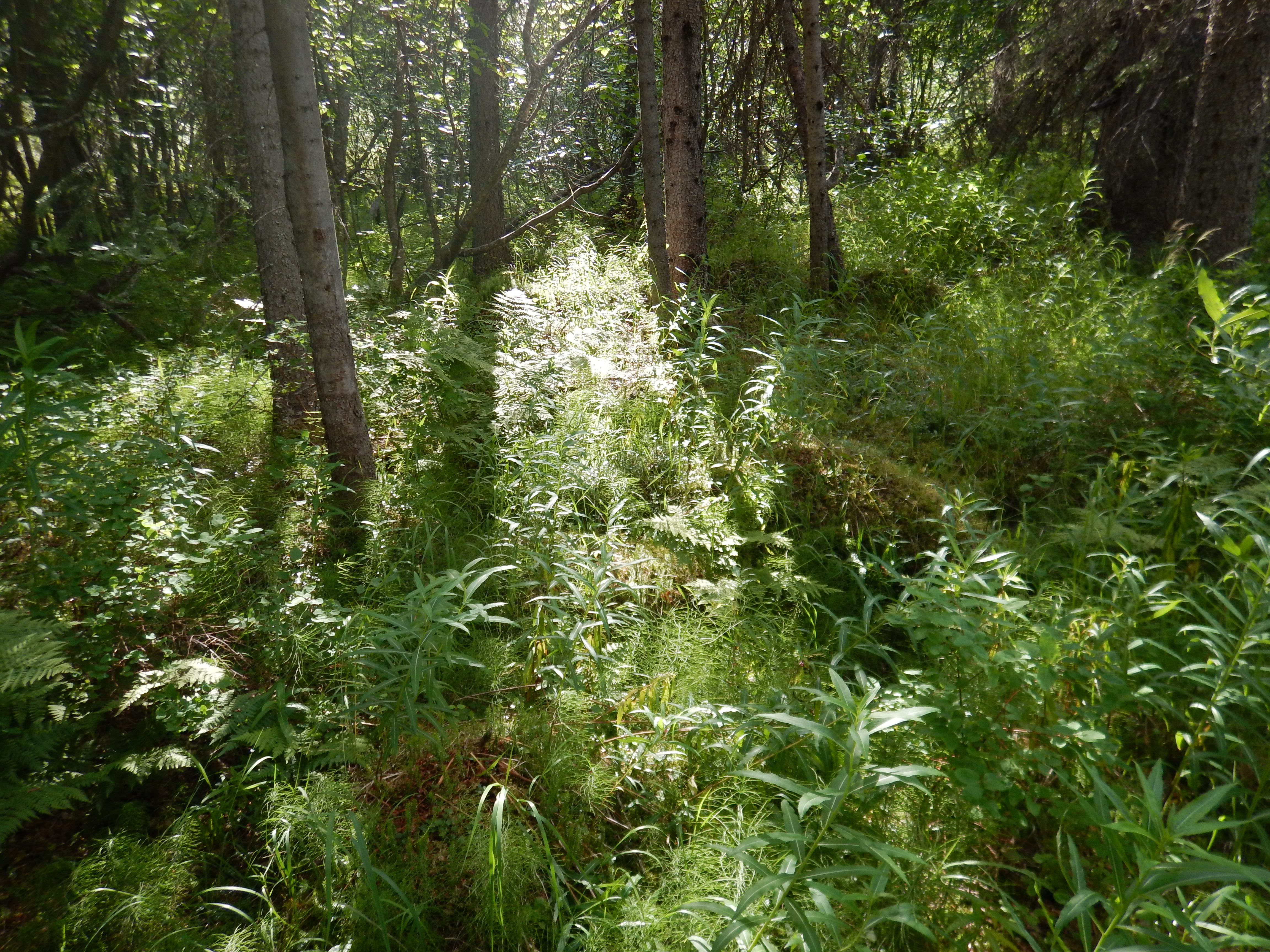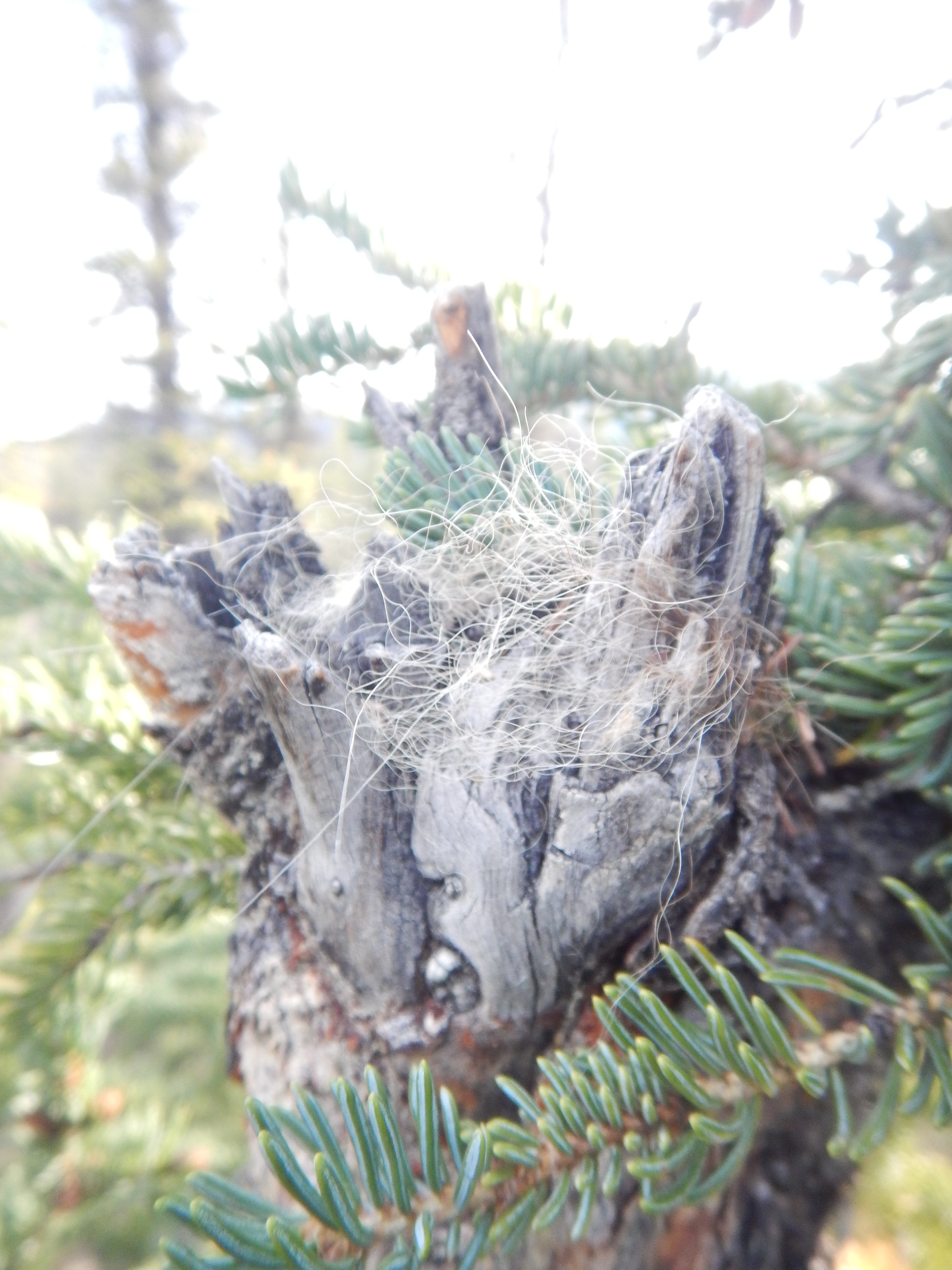 Moose fur on a broken tree. I suspect the moose has habitually crashed past this spot so often he finally broke down the tree and a collection of moose fur gradually built up.