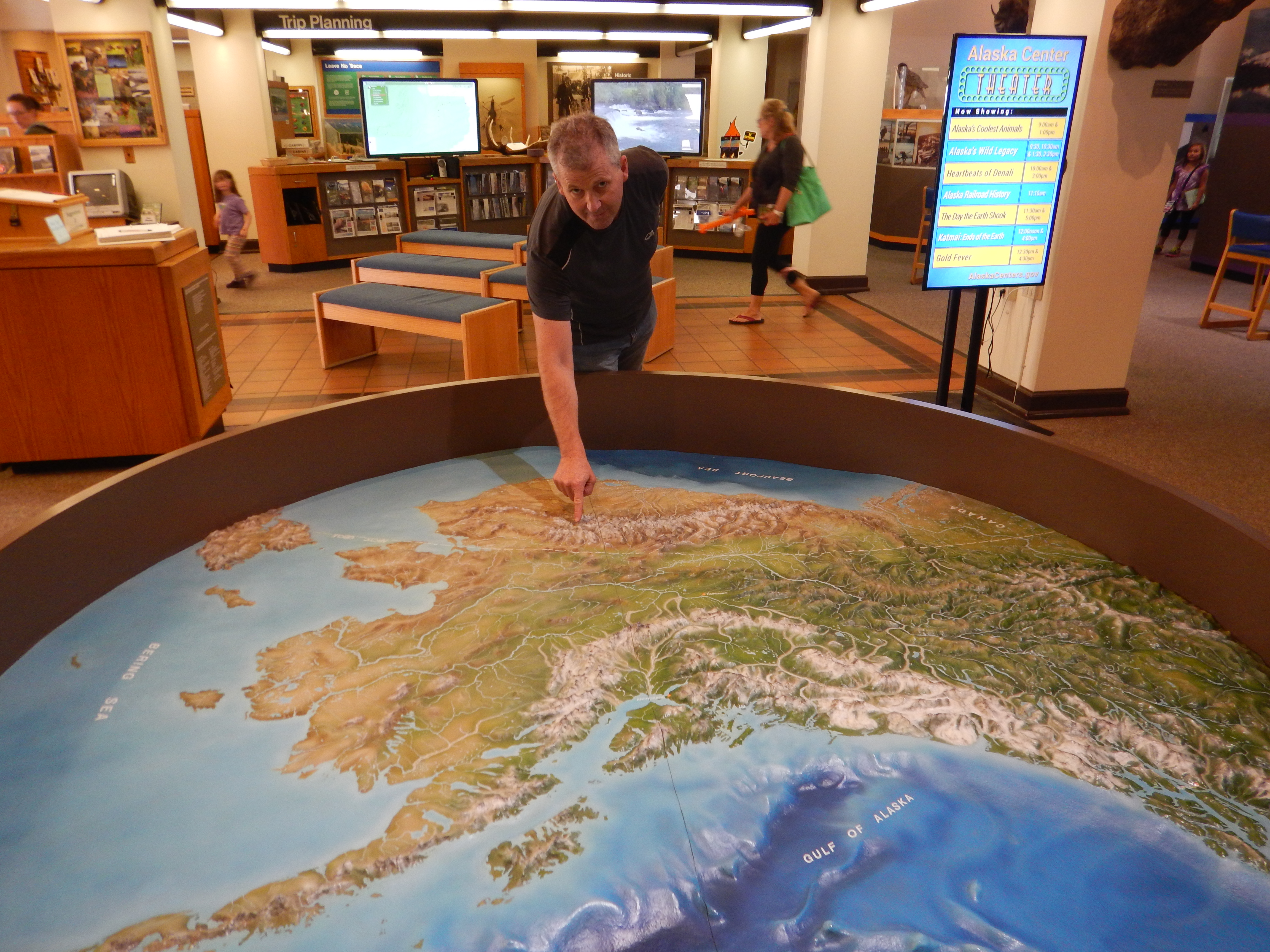 At the National Parks Visitor Centre in Anchorage, pointing out our route location on a 3-D model of Alaska. Later on Day 0 we flew to Fairbanks.