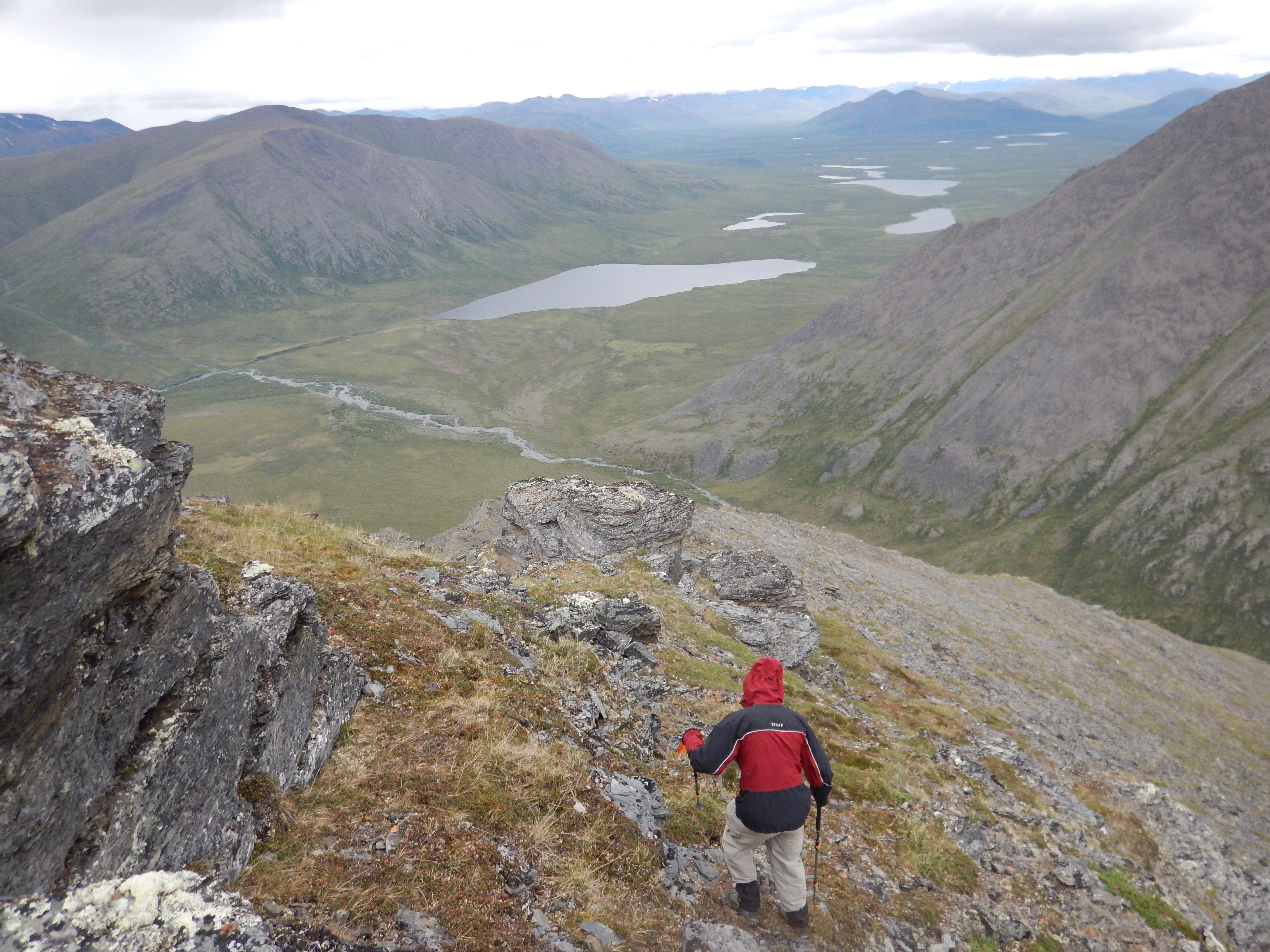 Pete descending the first peak to our camp, on the bank of the braided stream running from the valley in the lower right corner of the picture. The Alatna River is the stream that exits the central lake to the left.
