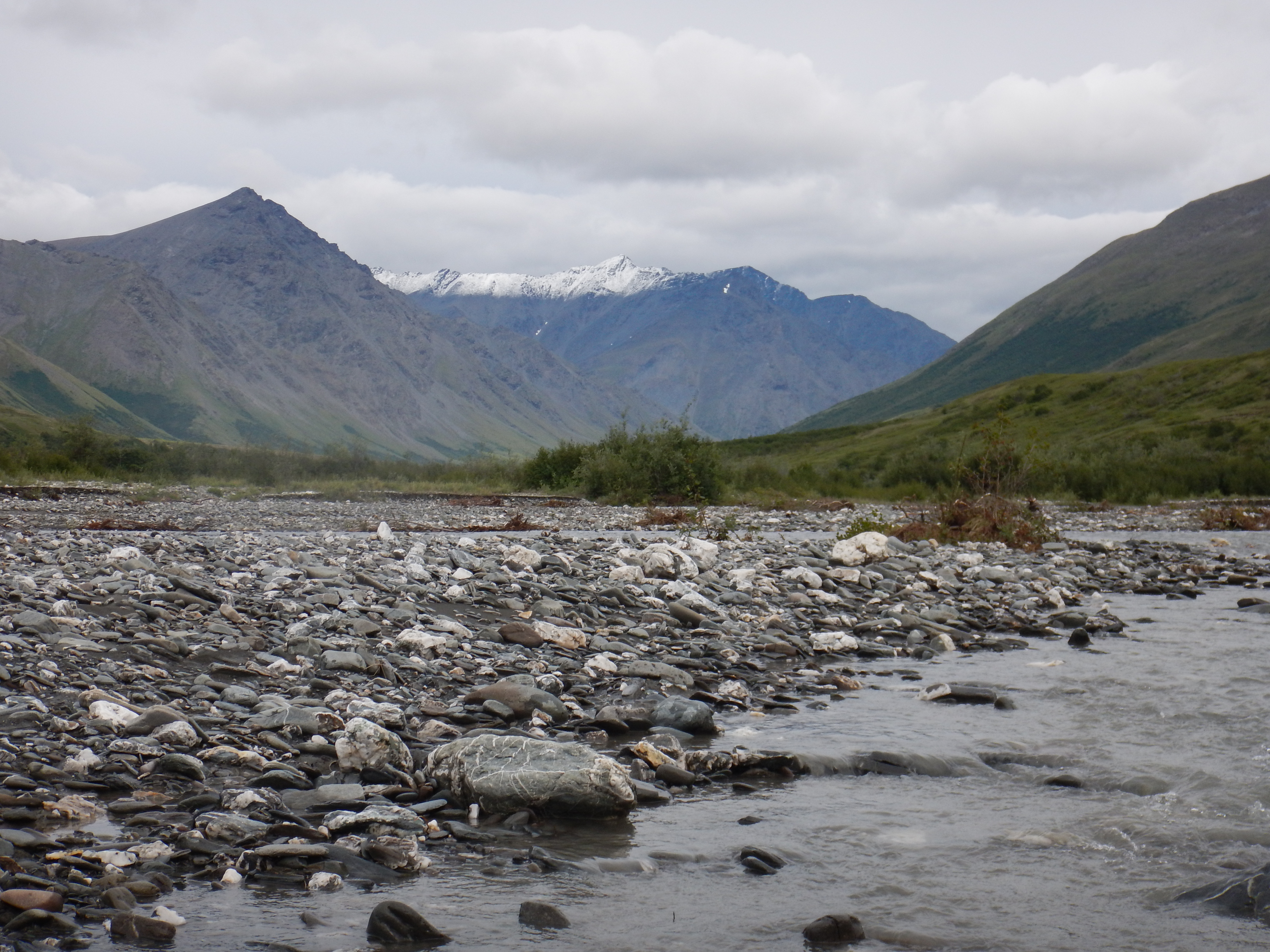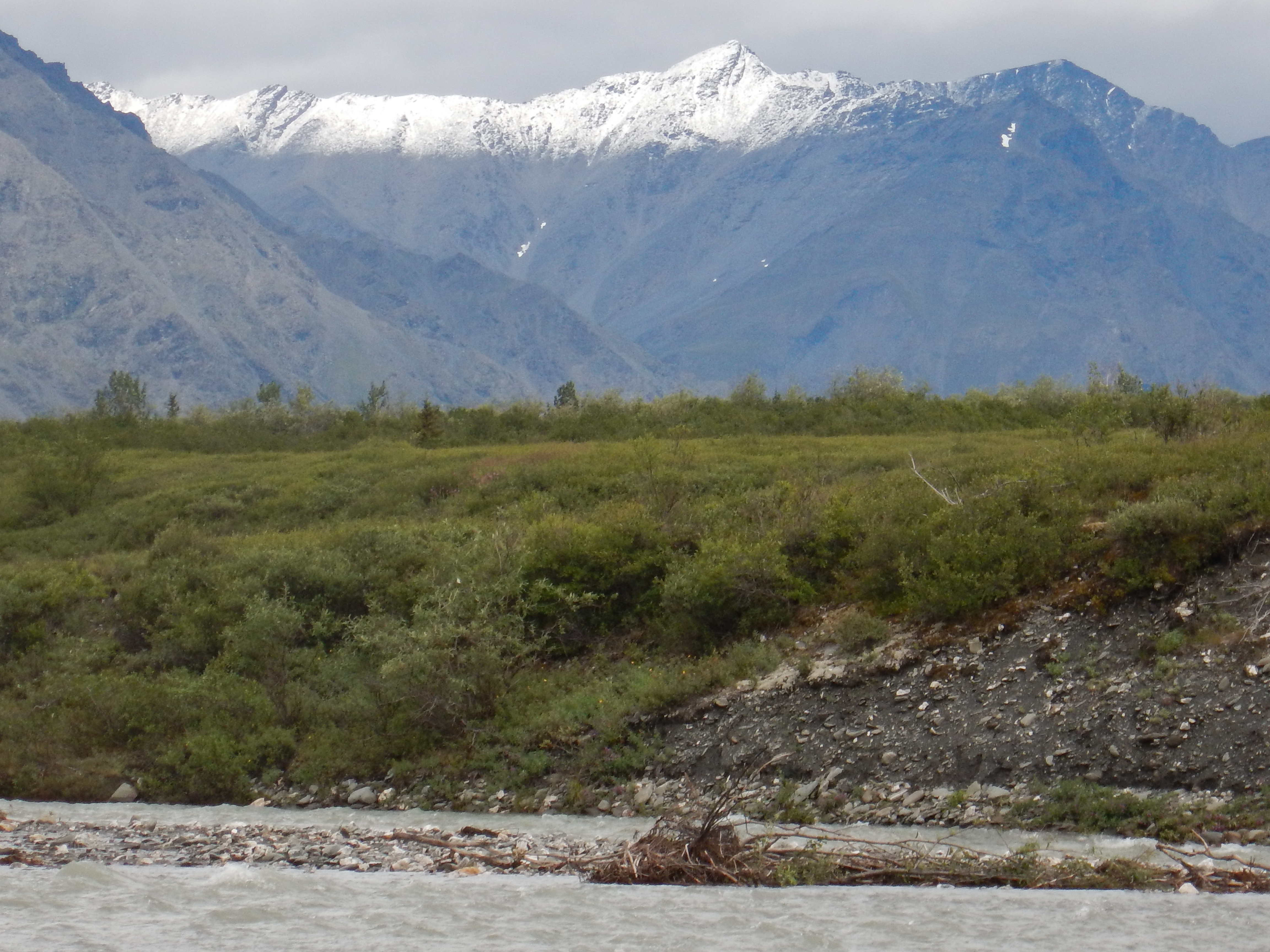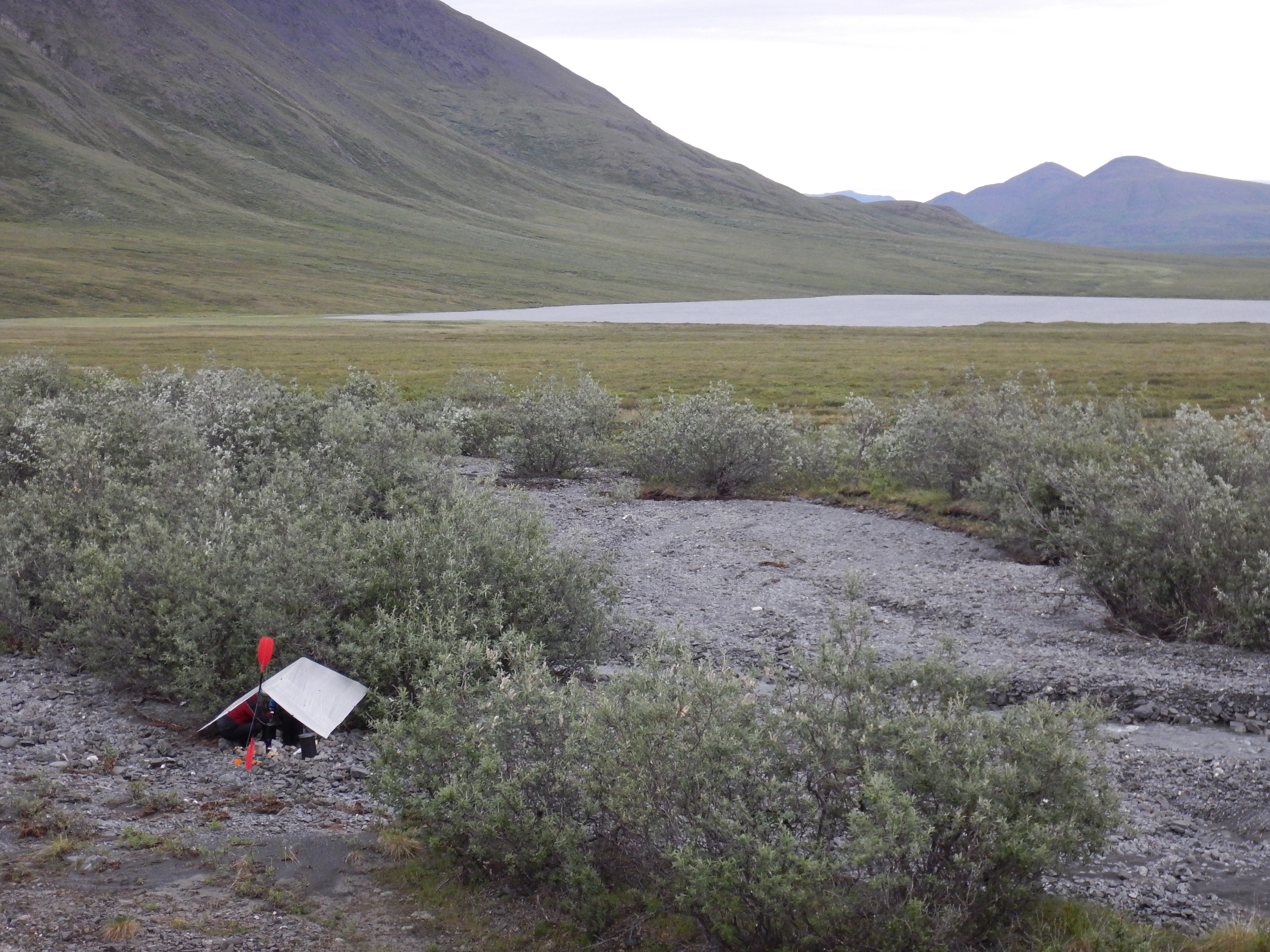 We woke to hail showers, occasional sleet and a bitter headwind. From its source in Gaedeke Lake, the Alatna is a small stream to begin with. We paddled mostly past permafrost and tundra, with the only shrubs a few stunted willows by the river bank.