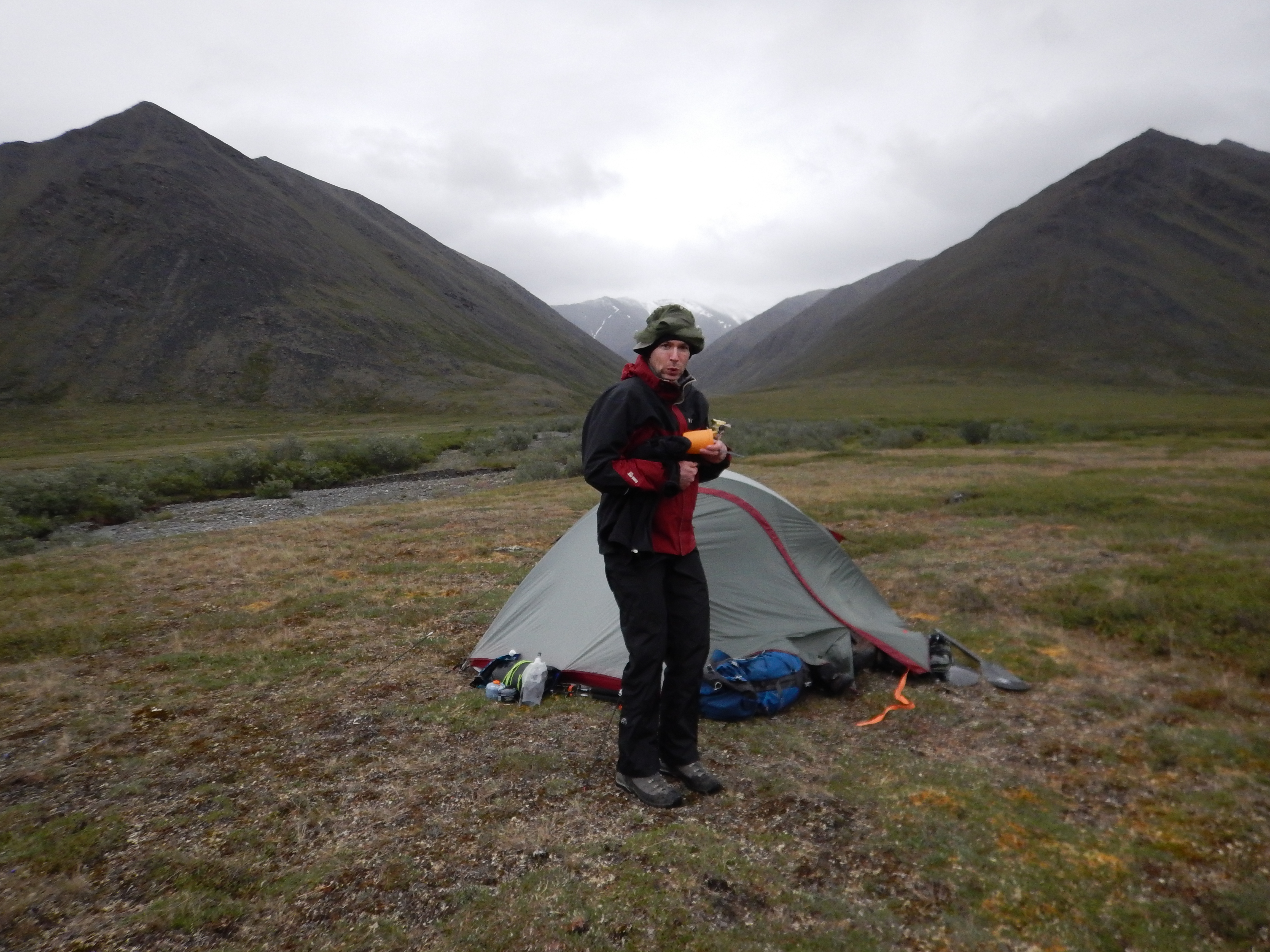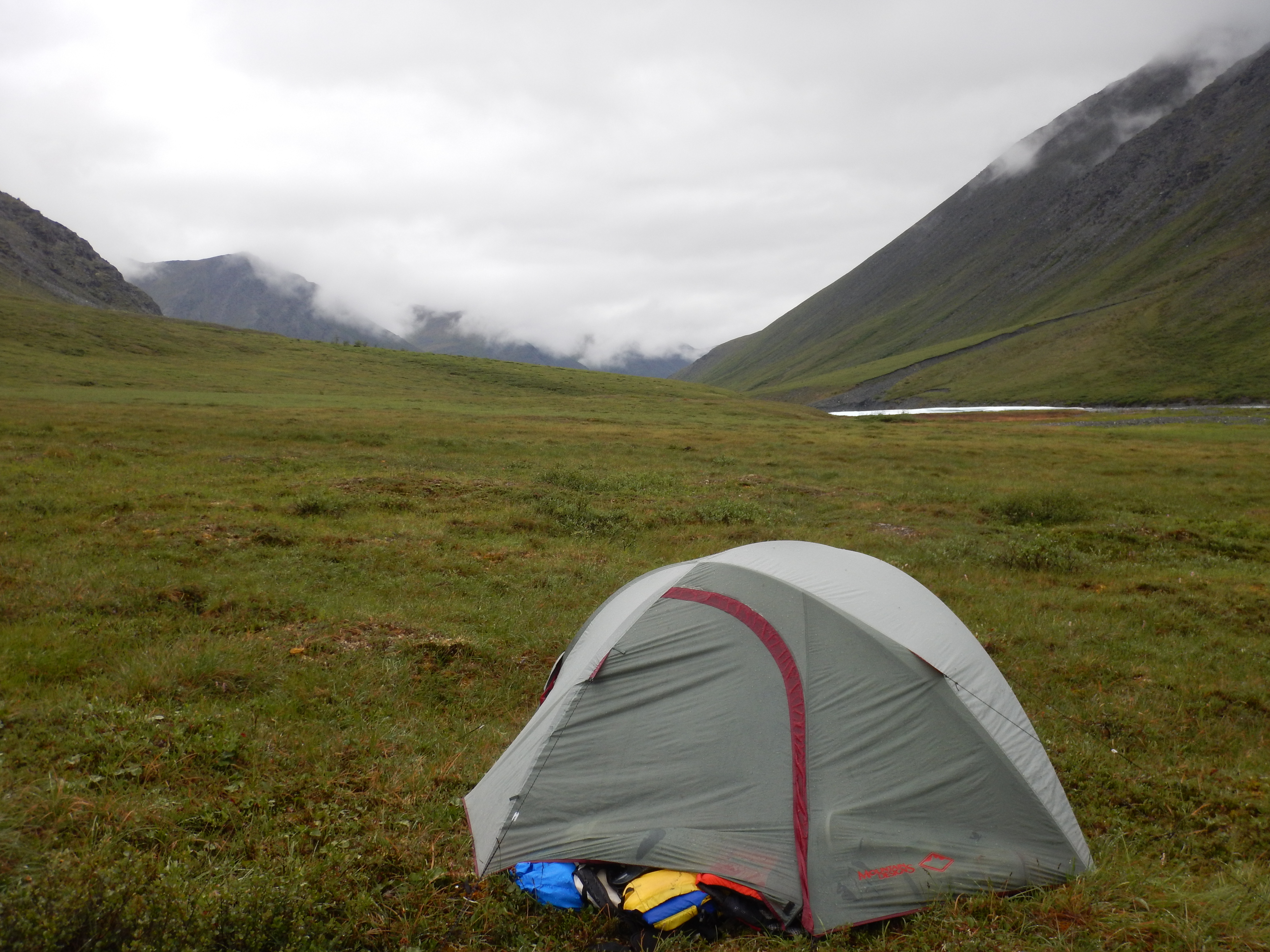 Our first tent site. Mostly heavily overcast but with clear visibility, Day 1 was a good introduction to Alaska. The wind was bitingly cold and brought occasional light hail showers. The tent is a Mountain Designs Kaon, a discontinued minimalist 3-person silnylon tent which proved to be quite suitable for the conditions encountered.