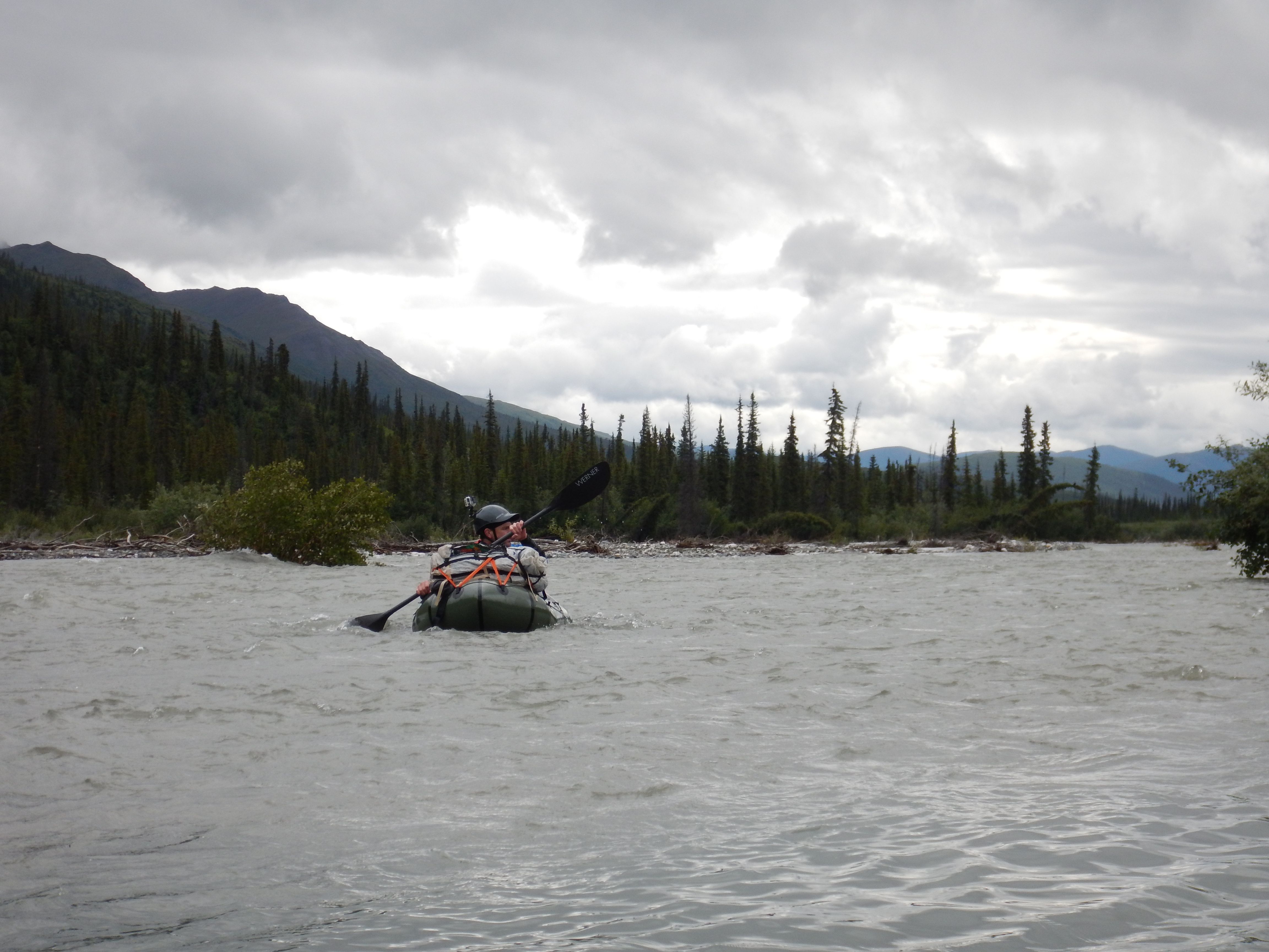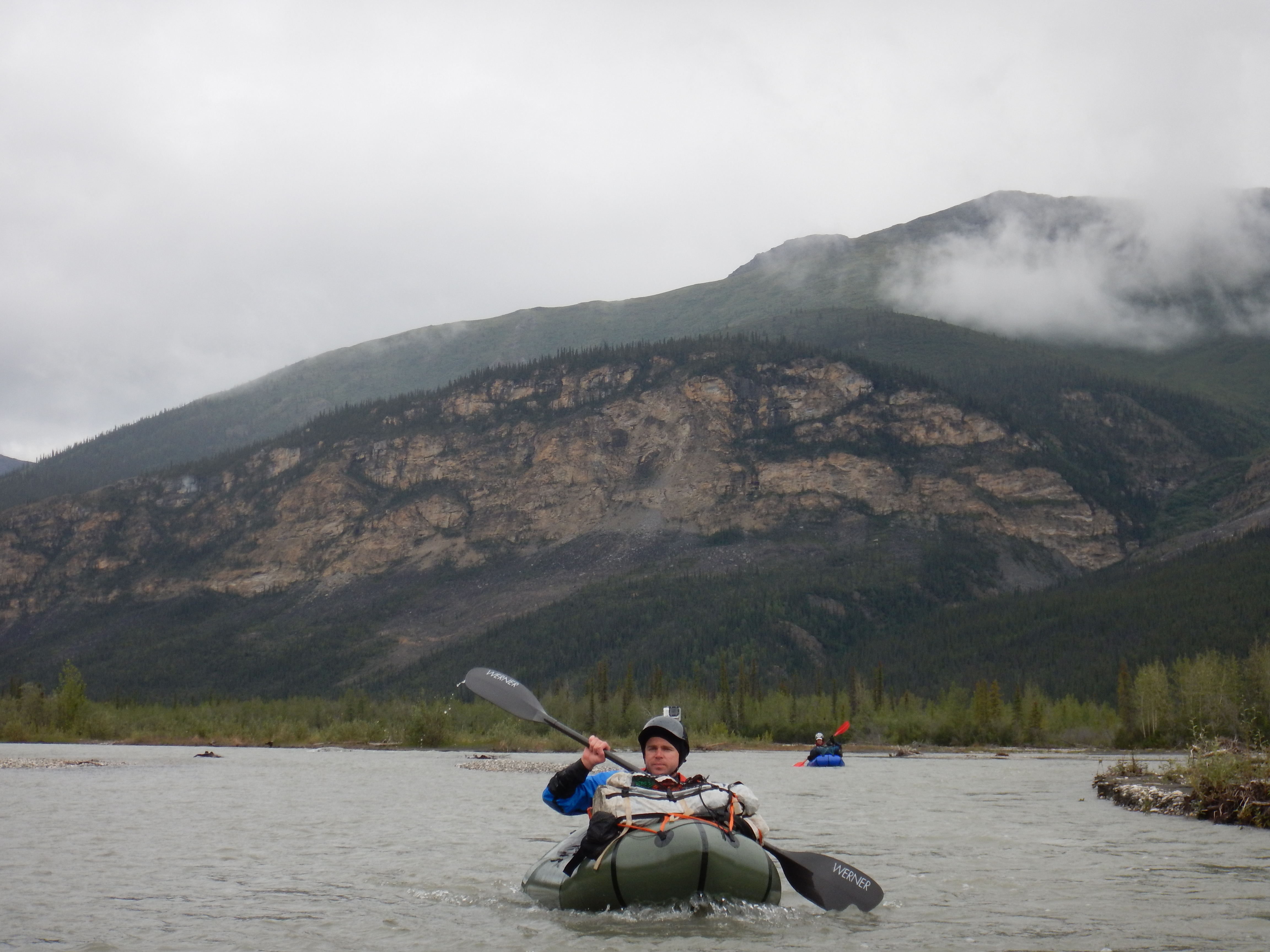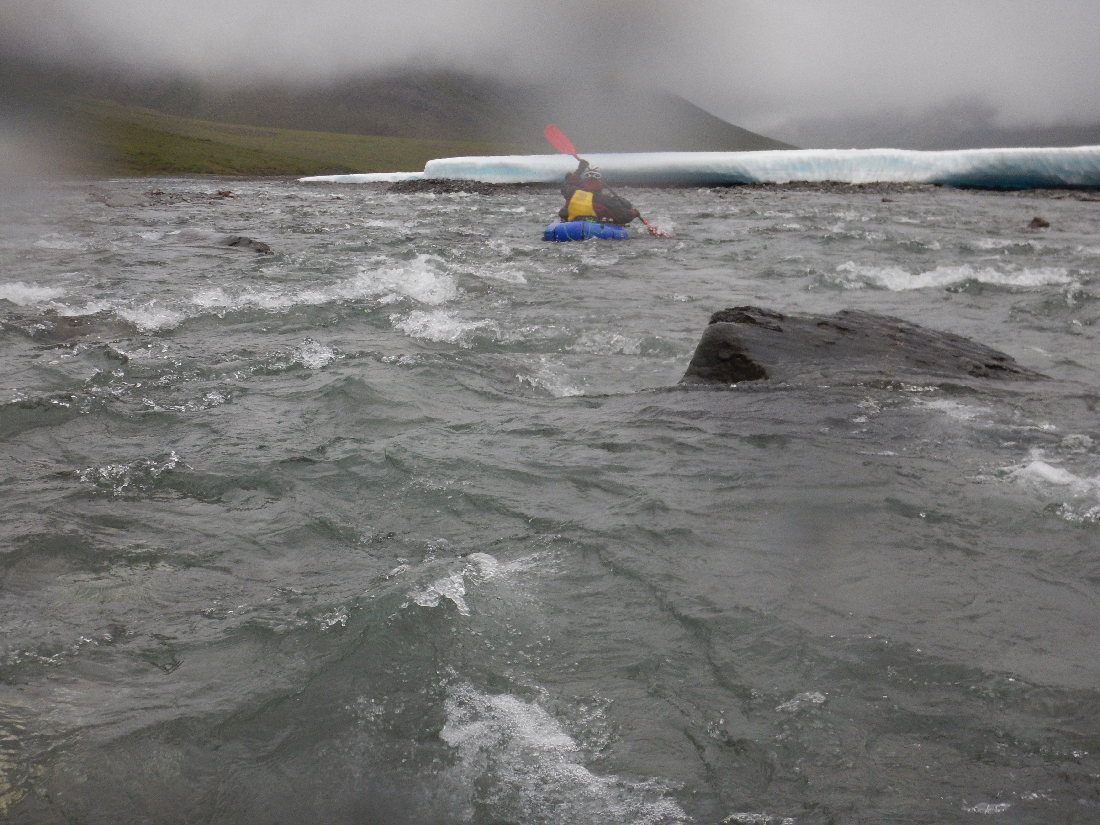Large sheets of aufeis lined the banks in the upper reaches of the river. With a bitter headwind and freezing water, our hands and feet became numb with cold on this day. I had thin merino woollen gloves with Gore-Tex overmitts, and in hindsight, I wish I had taken my Patagonia wool-lined neoprene paddling gloves because my hands were like ice-blocks by the time we were forced off the water by cold in mid-afternoon. I had an Alpacka Trekker drysuit and was comfortable on legs, arms and torso, but my feet were numb with cold, despite having Sharkskin socks inside my drysocks. Matt and Pete were similarly challenged by the cold, although with slightly different combinations of gloves and foot protection. This is the one area in which we were slightly underprepared, and we had to rely on mental toughness to work through cold hands and feet. I had a pair of woollen walking socks I could have added to my Sharkskin and drysocks, but I was stubbornly keeping those in reserve for the Arrigetch Peaks. Lower on the river towards Circle Lake, with water a few degrees warmer and better weather, it wasn’t an issue, but in the iciest headwaters and with cold weather, hand and foot protection was a problem. Next time I’ll be taking better foot protection and my thick neoprene paddling gloves.