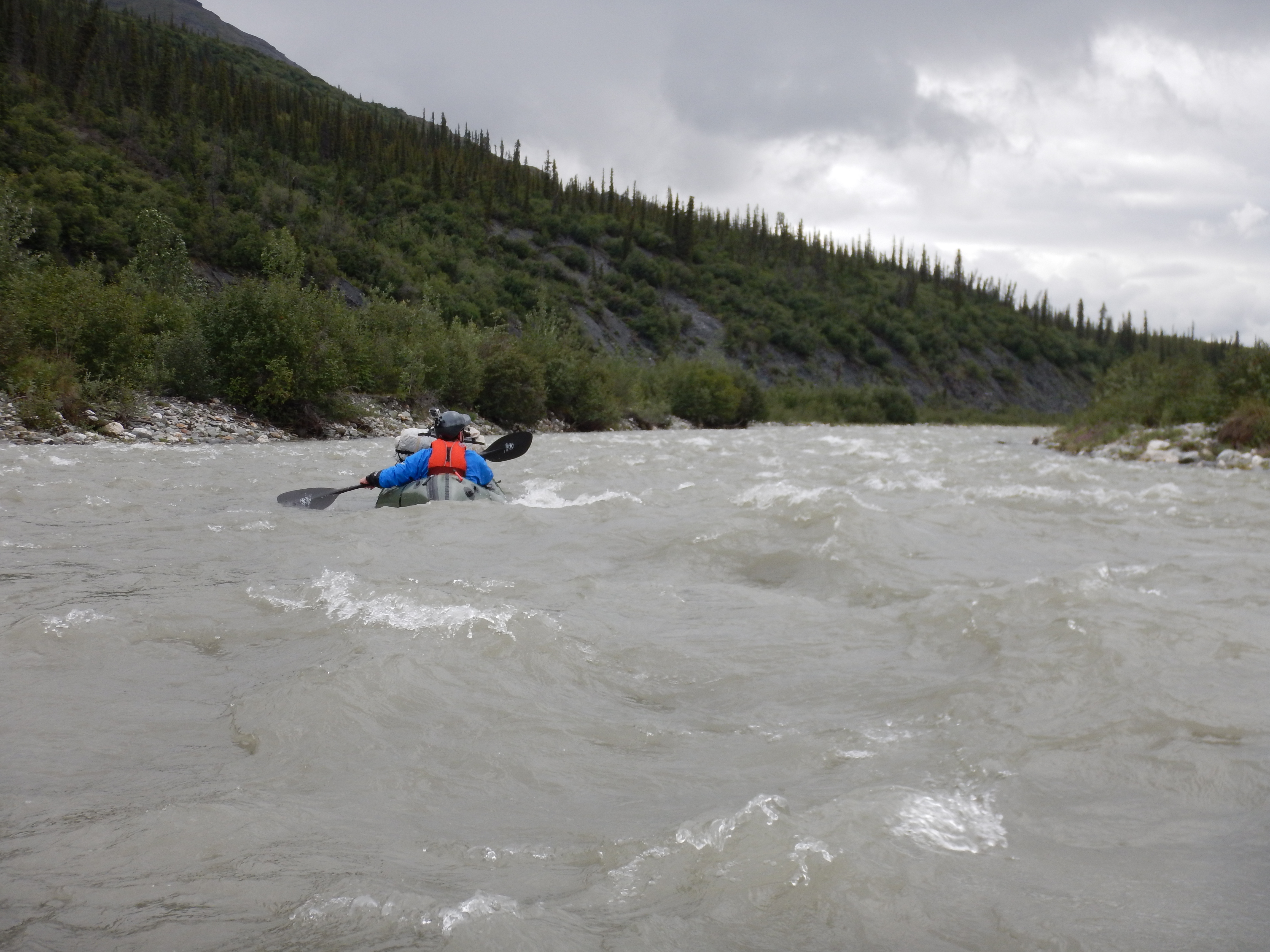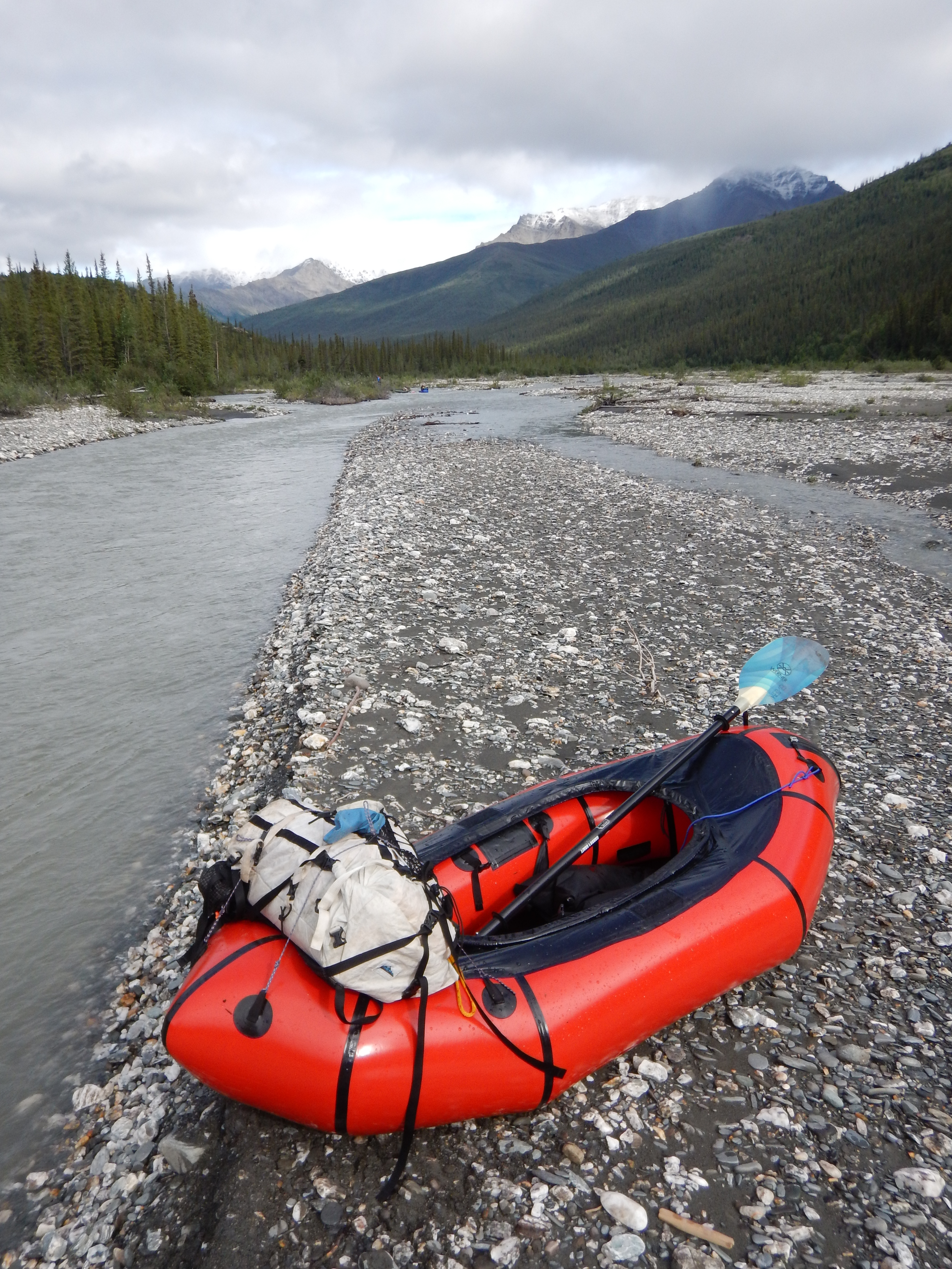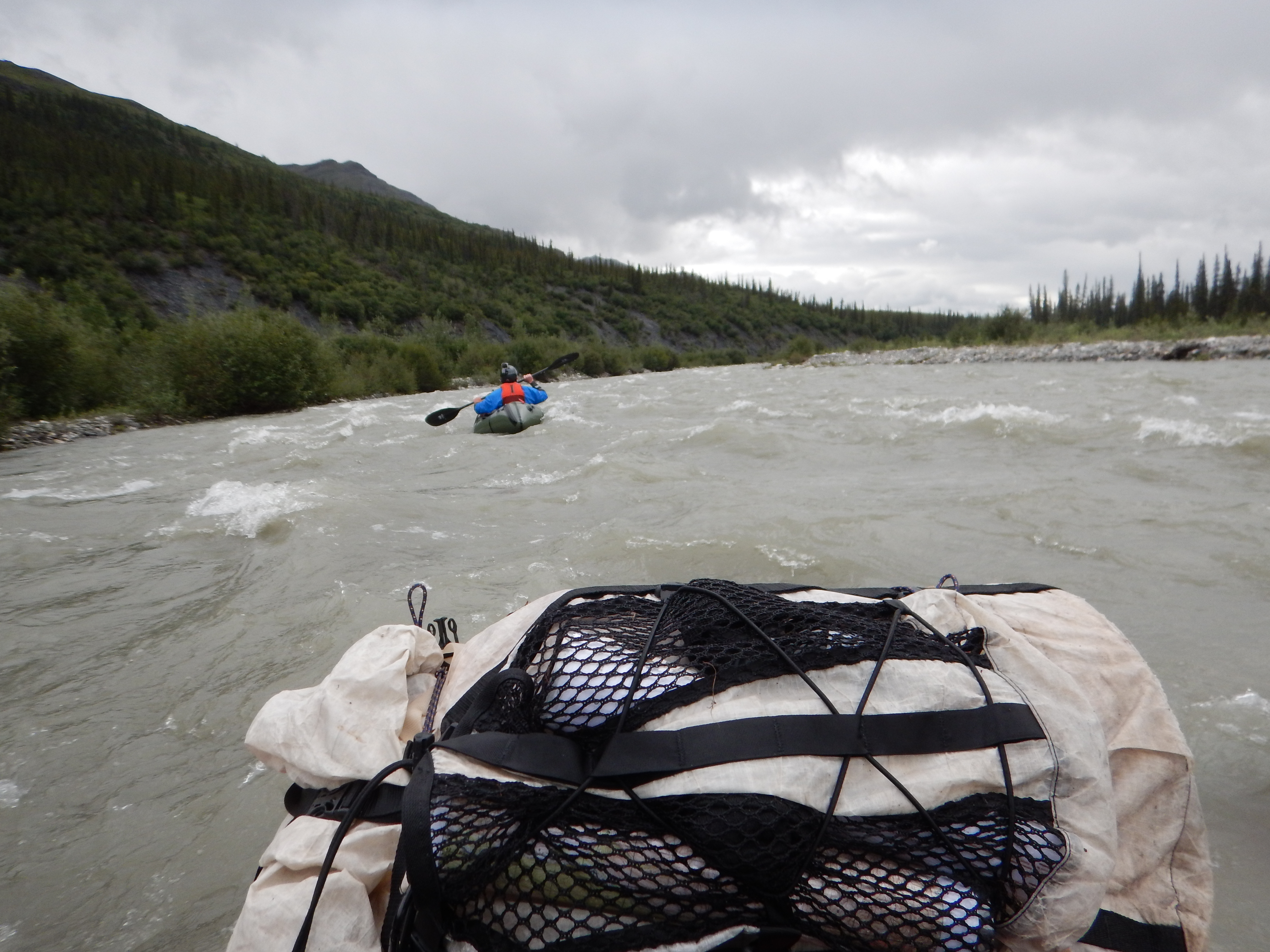 Both Matt and I have the new model Alpacka boats with the Cargo Fly for internal storage, however the internal storage cannot accommodate a bear barrel, so these were stowed in our HMG Porter rucsacs on the foredeck.