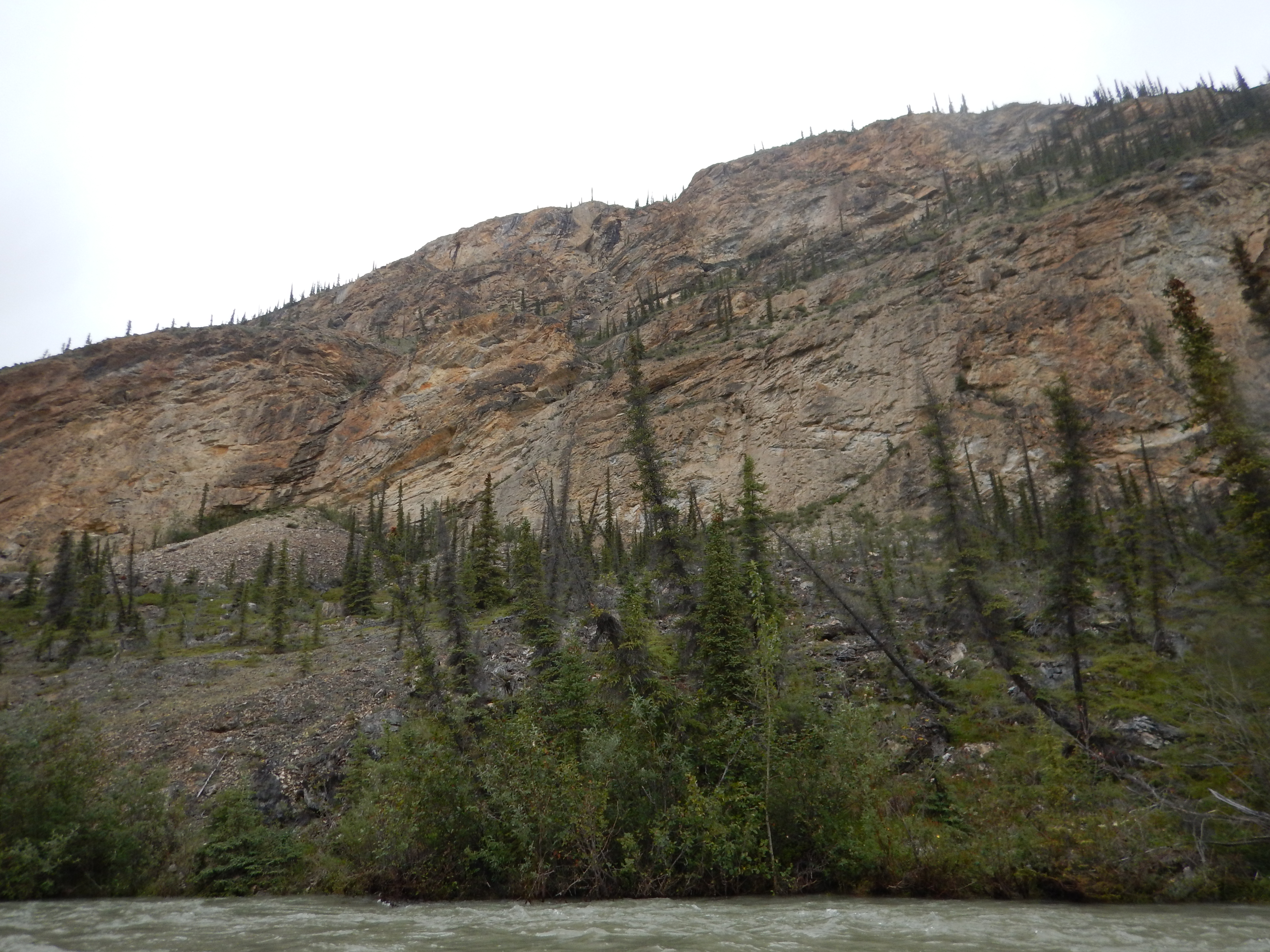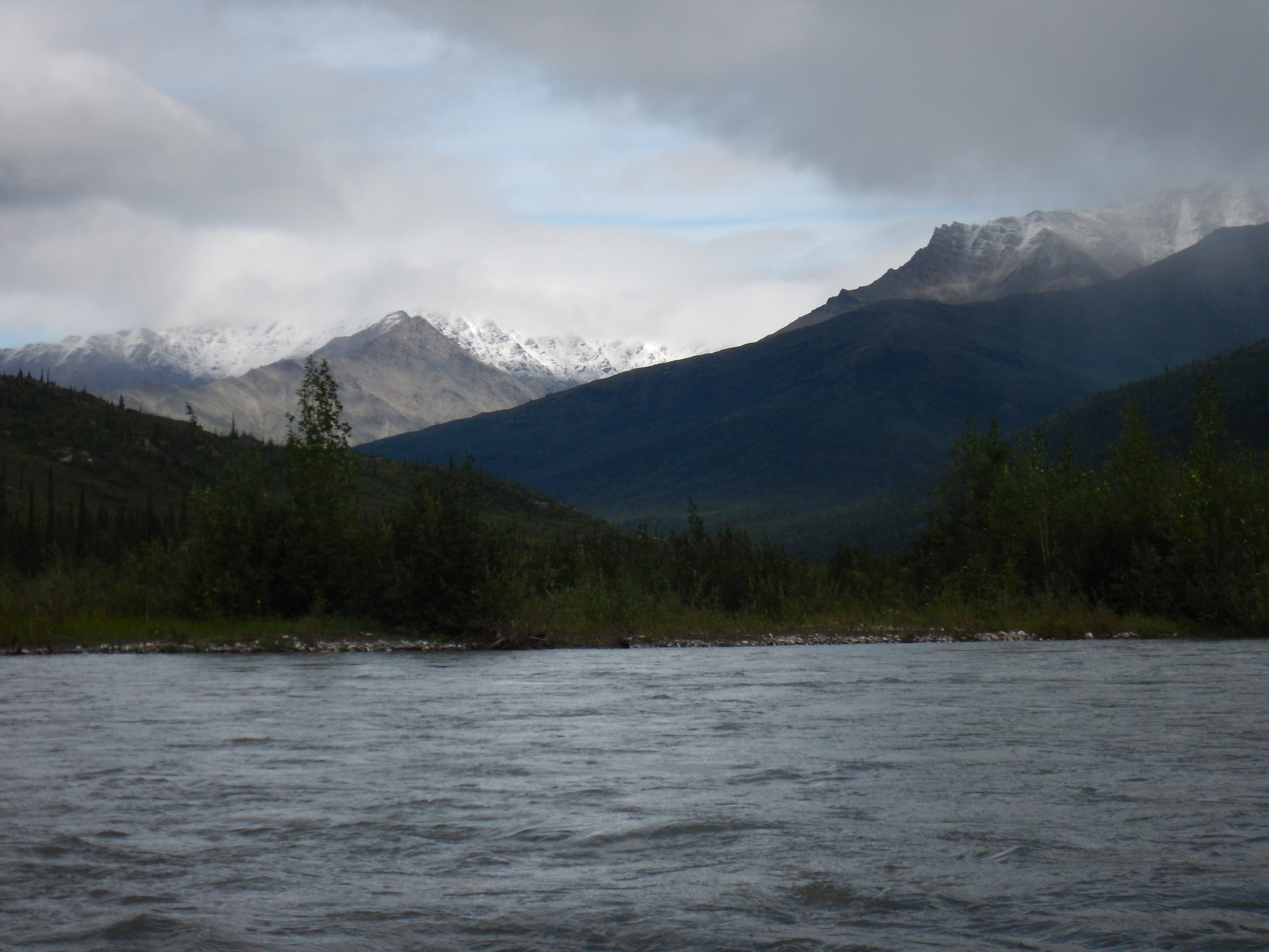 The river was fast and cold. We were keen to see the first Spruce trees, to provide a modicum of shelter from the cold headwind.