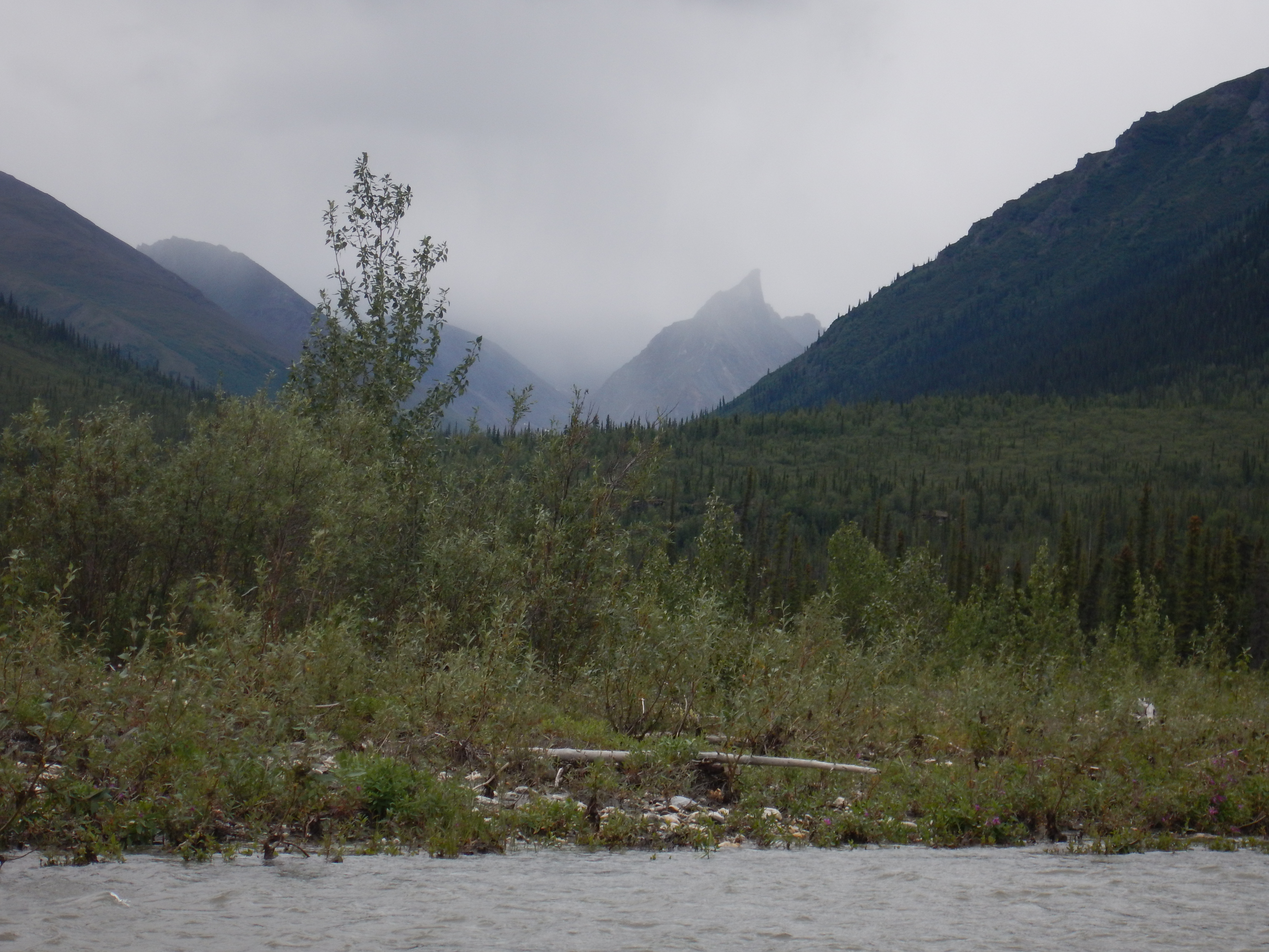 Campsite for Day 4, amongst the Spruces and Birches. We had covered about half the distance to Arrigetch Creek on this day, thanks to high fast water. This habitat obviously had more to interest a hungry bear than the tundra of the upper reaches, so we reverted to careful camp-craft with cooking and food storage.