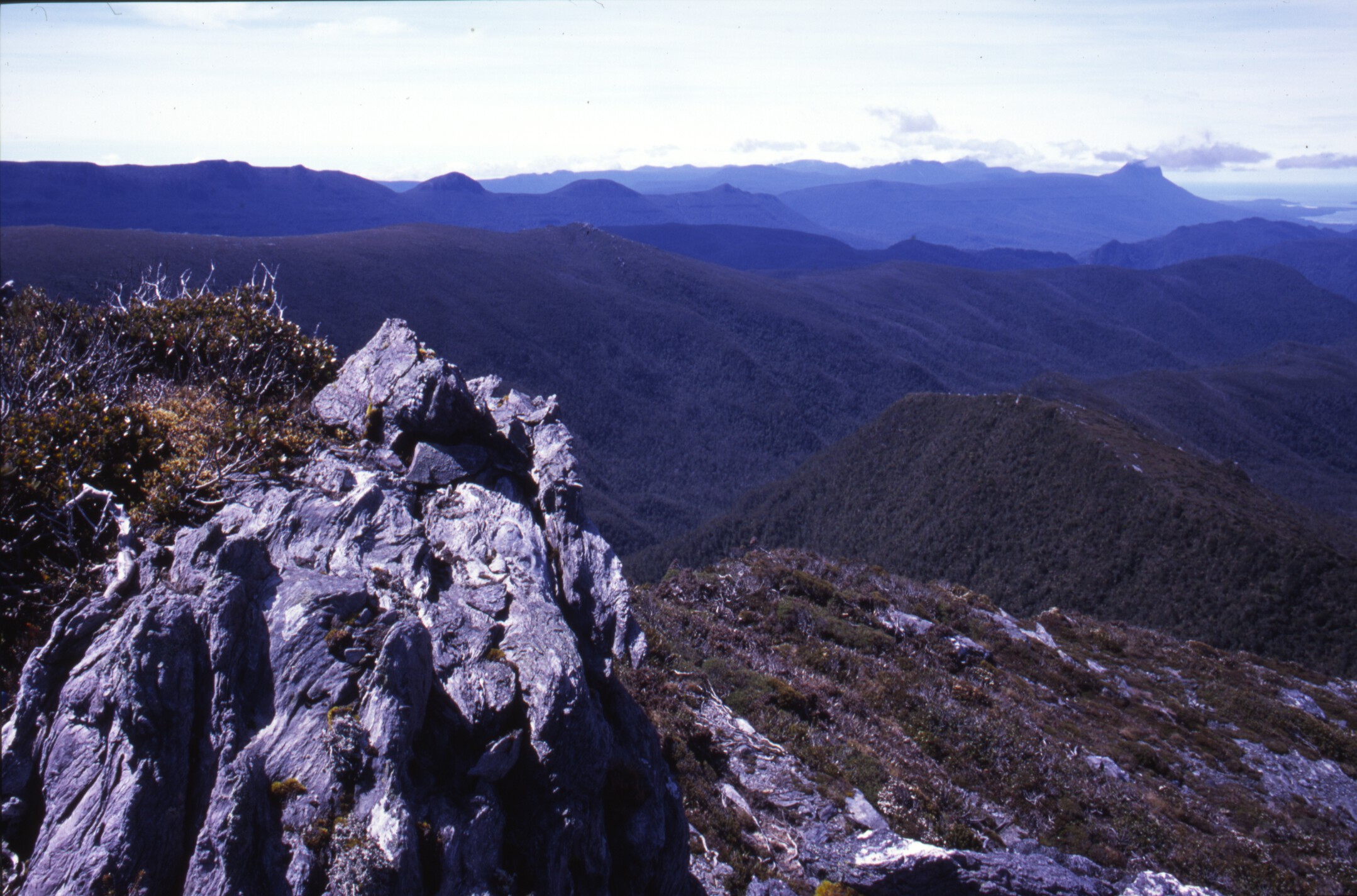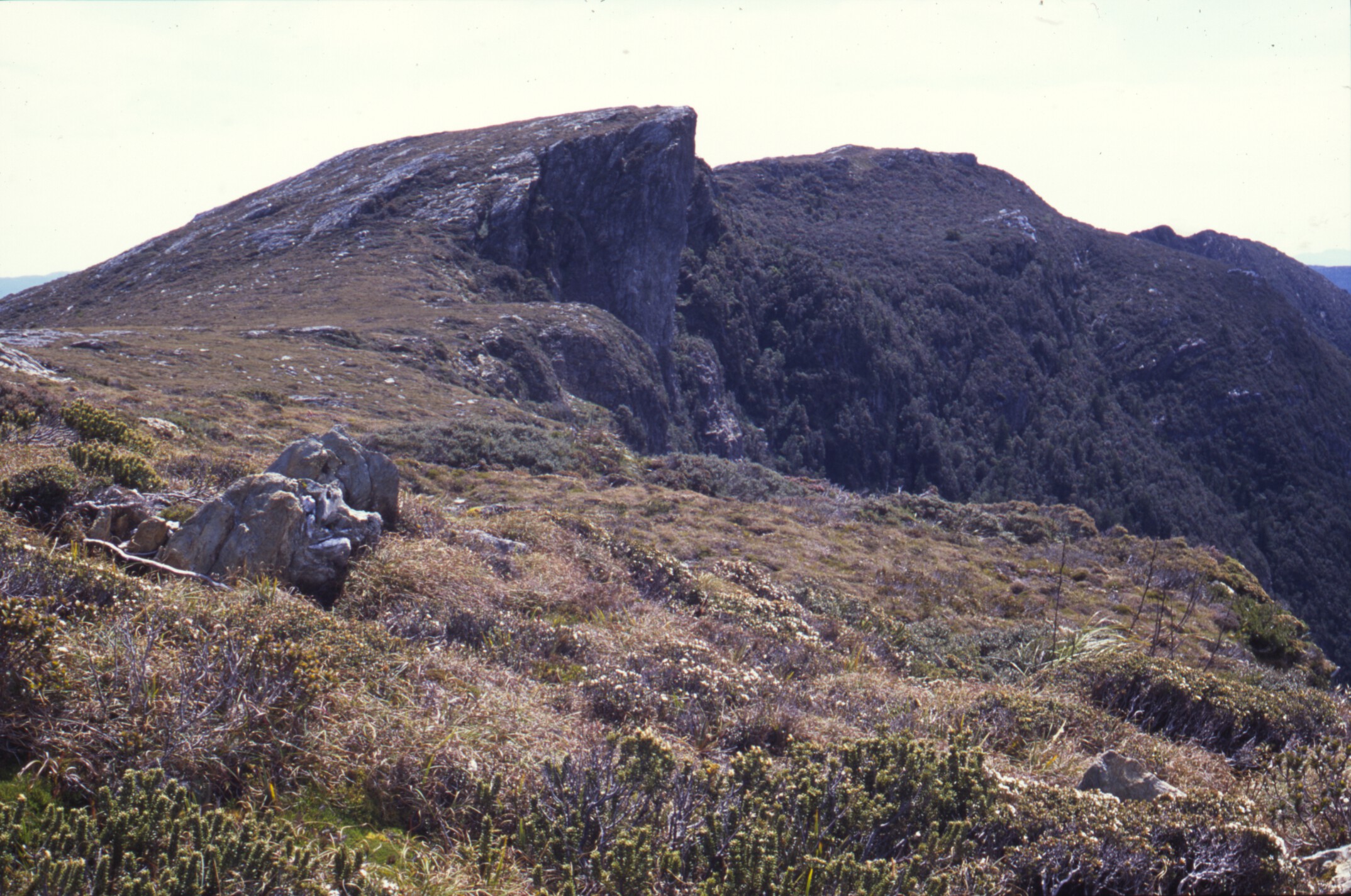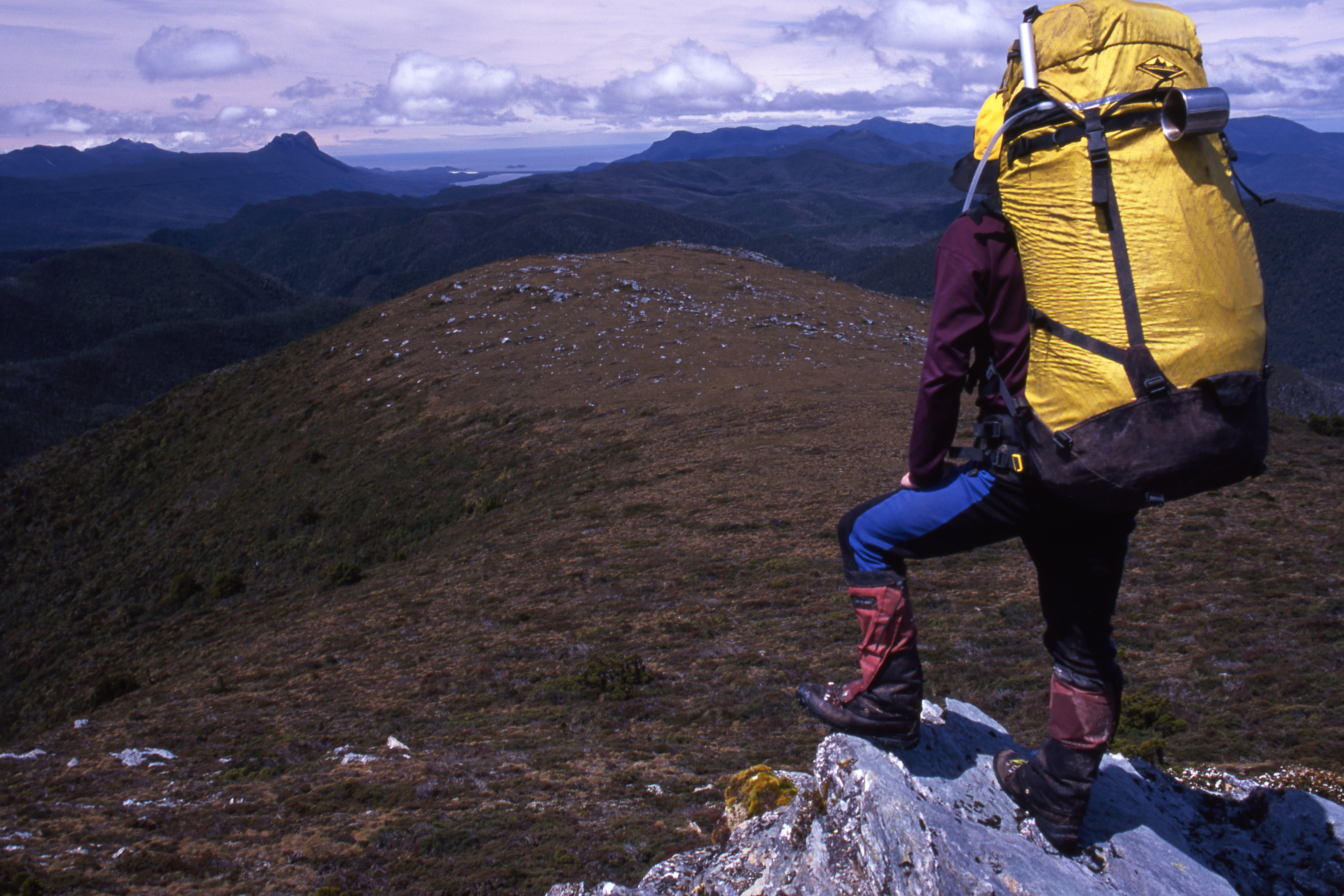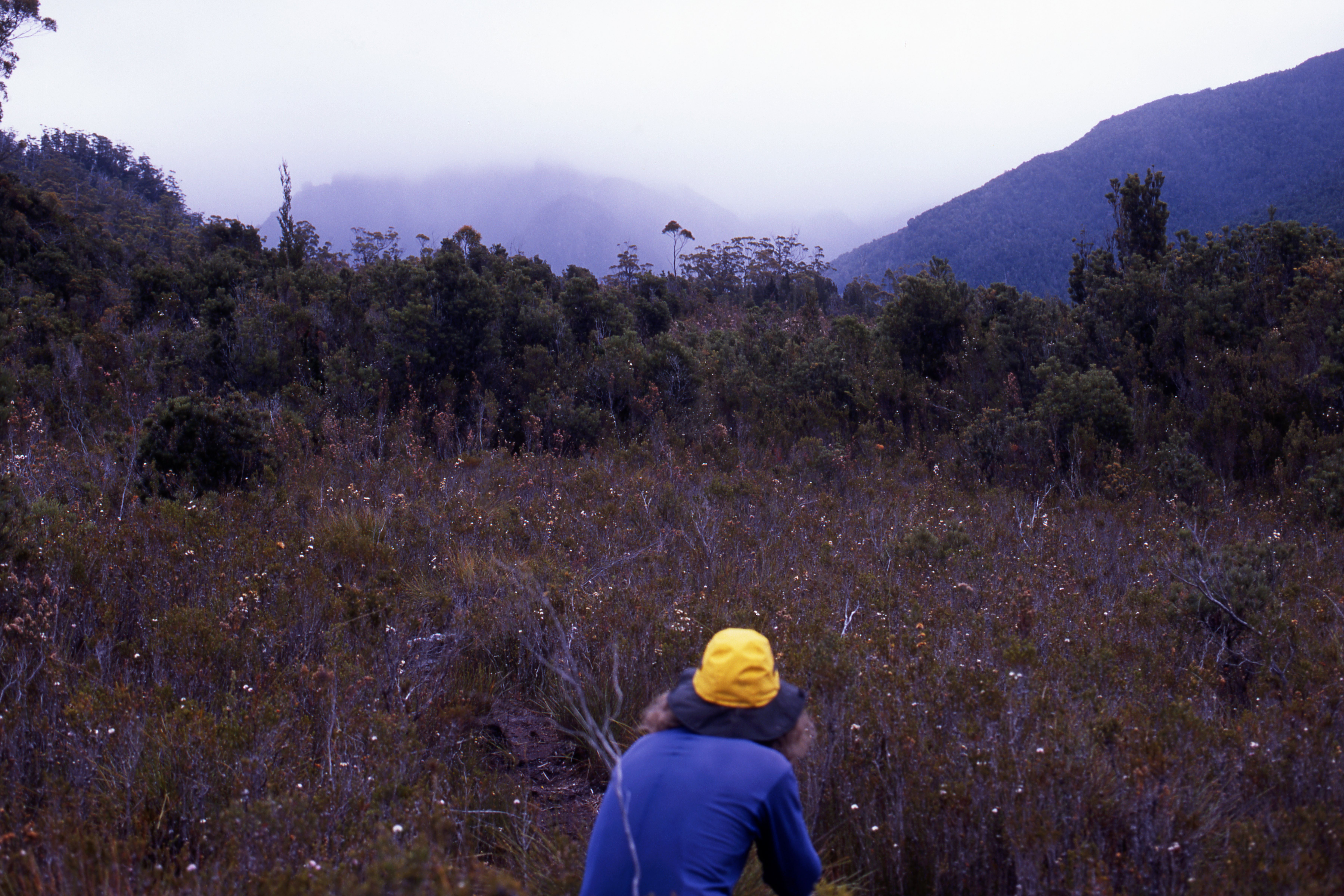 From the summit of the Crest Range we began our descent into Tasmania’s wildest valley: we didn’t see a sign of people or their passage for the next six days. We had been warned that the scrub on the southern flanks of the Crest Range might be ‘character building’ and it was: hour after hour of pushing through complex pandani mazes, deep moss-choked gullies, and craggy cliffs with vines and trees clinging at impossible angles.