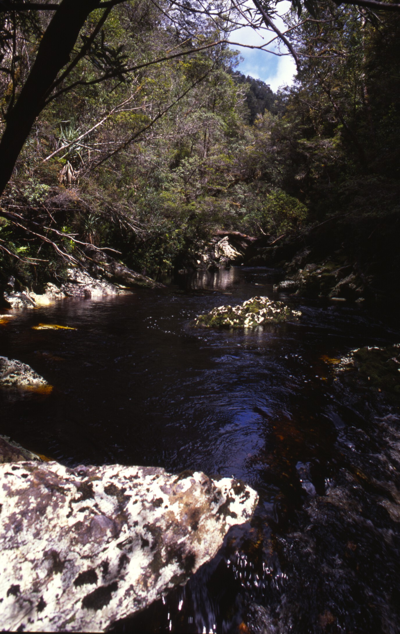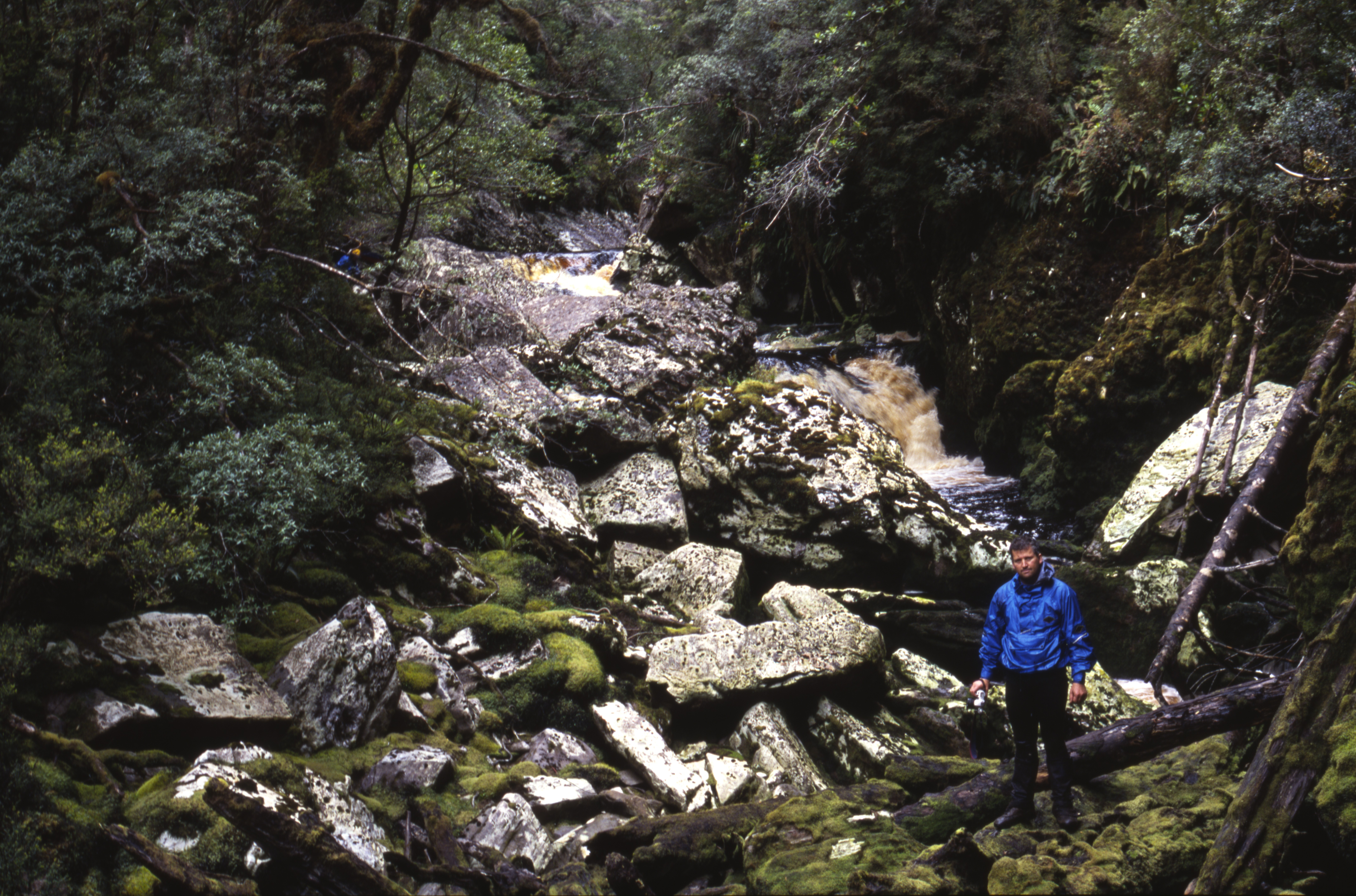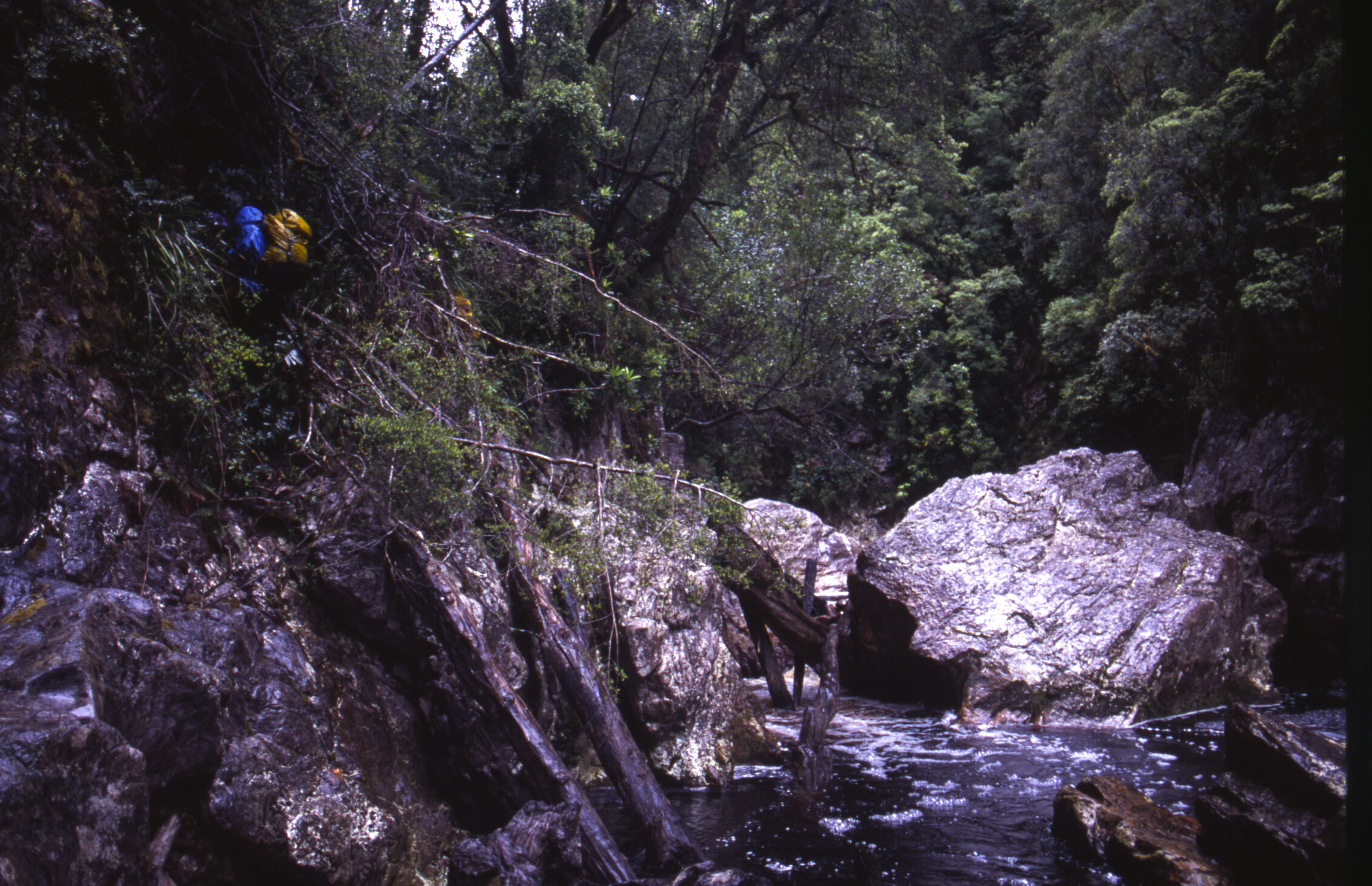 Stretches of runnable water below the tent teased us into inflating our lilos and donning wetsuits to paddle the next morning. Rain squalls and chill winds accompanied us on to the river. The valley flanks were much steeper than most Tasmanian rivers, and for the next couple of days the river was contained at the bottom of tight chasms. Gorges with cliffs hidden under the rainforest made for very tough travel, which continually changed from strenuous scrub portages to river-rock scrambling. During two hard days in which we managed to cover only four kilometres, we encountered an unnamed rock arch over the river and a section where the entire river disappeared underground, only to resurface 100 metres downstream.